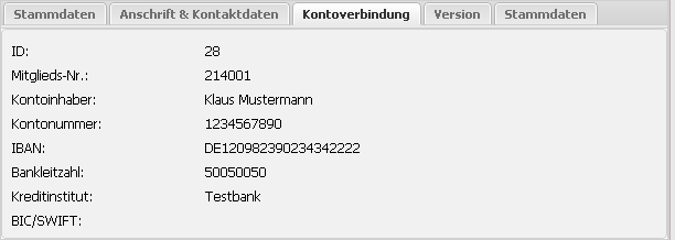 | Kontoverbindung | Hier wird beim Bearbeiten in der Maske zusätzlich noch einmal die Mitgliedsnummer angezeigt. |