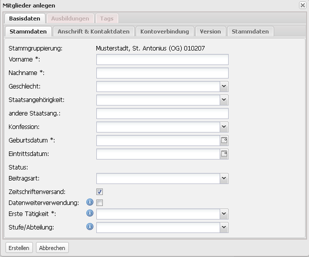 Beim Anlegen eines Mitglieds stehen nur die Basisdaten zur Verfügung. Verknüpfungen wie Ausbildungen und Tags sind naturgemäß noch nicht verfügbar, da eine Verknüpfung voraussetzt, dass ein Mitglied bereits existiert.