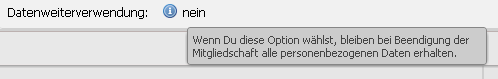 | Datenweiterverwendung | Je nach Konfiguration des Systems werden bei Beendigung der Mitgliedschaft entweder alle Daten gelöscht oder das Mitglied wird nur auf inaktiv gesetzt und die Daten bleiben erhalten. Sofern das Feld "Datenweiterverwendung" angezeigt wird, kann durch Ankreuzen erreicht werden, dass die Daten beim Beenden der Mitgliedschaft nicht gelöscht werden. | Sofern Datenlöschung immer der Fall sein soll, sollte diese Option gar nicht angezeigt werden. |