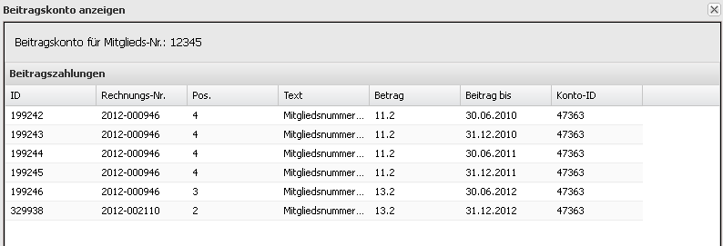 Im Beitragskonto eines Mitglieds tauchen die entsprechenden Positionen auf, sobald die Rechnung erstellt wurde. Es ist dabei unerheblich, ob die Rechnung schon freigegeben wurde (siehe Rechnungsverwaltung).