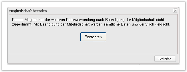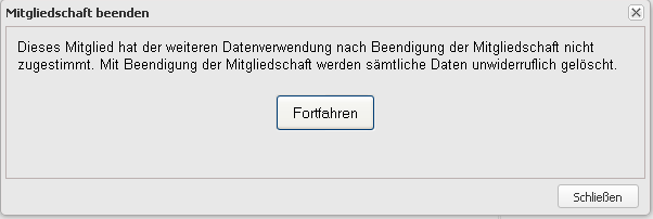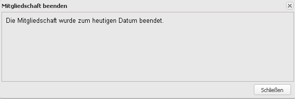 Mit "Fortfahren" wird das Mitglied in den Status inaktiv überführt. "Schließen" bricht den Vorgang ab. Die erfolgreiche Beendigung der Mitgliedschaft wird mit folgender Meldung bestätigt: